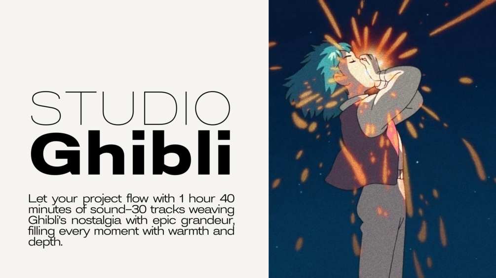 Elevate your project with 1 hour 40 minutes of premium cinematic and ambient soundtracks spread across 30 beautifully composed tracks. Inspired by the nostalgic charm of Ghibli and infused with epic cinematic energy, Wollusound brings a perfect balance of warmth and grandeur to your creations.